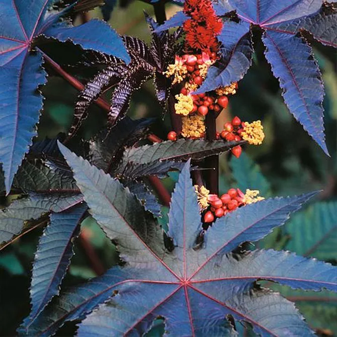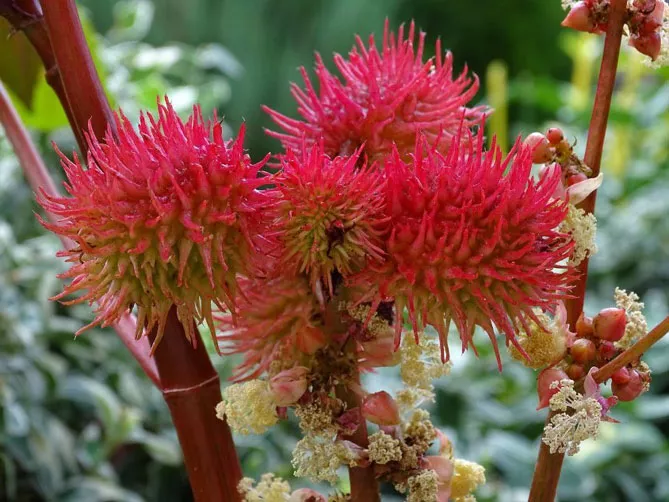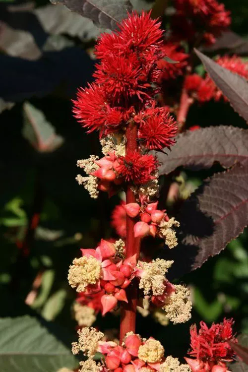 Сорти клещевини різняться за зростом і кольором листя та квітів: