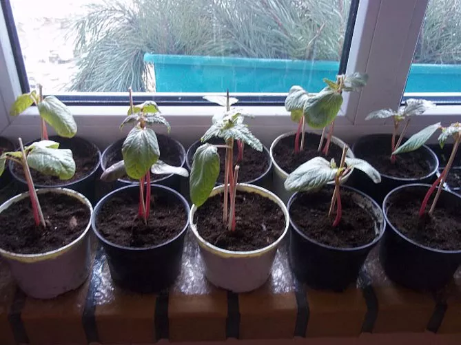 Після проростання переносимо розсаду на сонячну позицію. Сходи дуже швидко ростуть. Оскільки сонячного світла у березні ще мало, сіянці сильно витягуються, і ми отримуємо два насіннєві листочки на дуже довгій ніжці. Можна посадити розсаду в окремі горщики глибше, укоротивши таким чином ніжку, заглибивши її в ґрунт. Також при посадці в ґрунт можна посадити сіянці глибше, ніж вони росли в горщику.