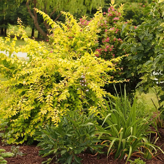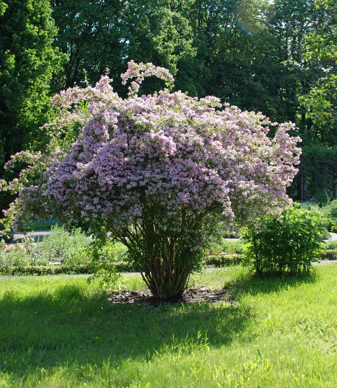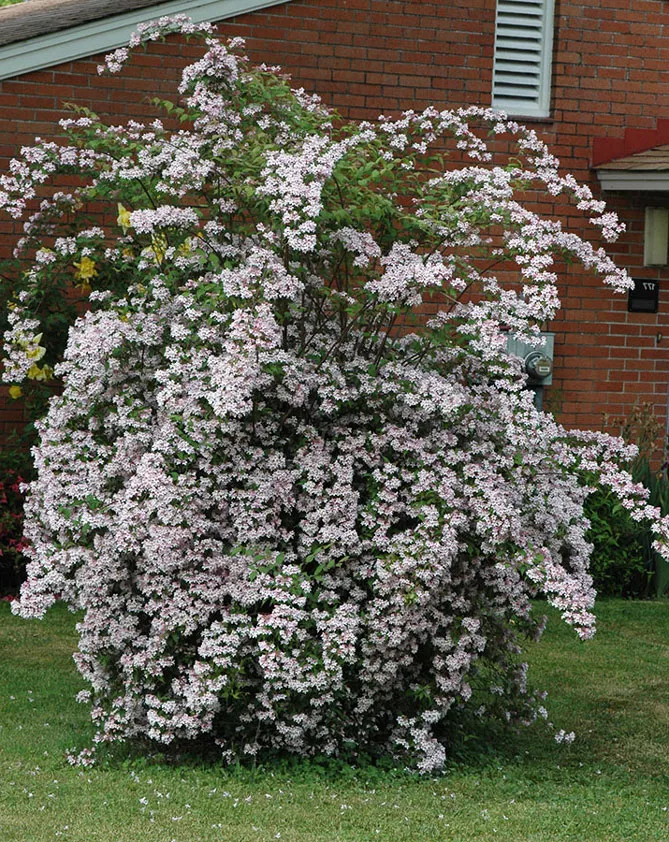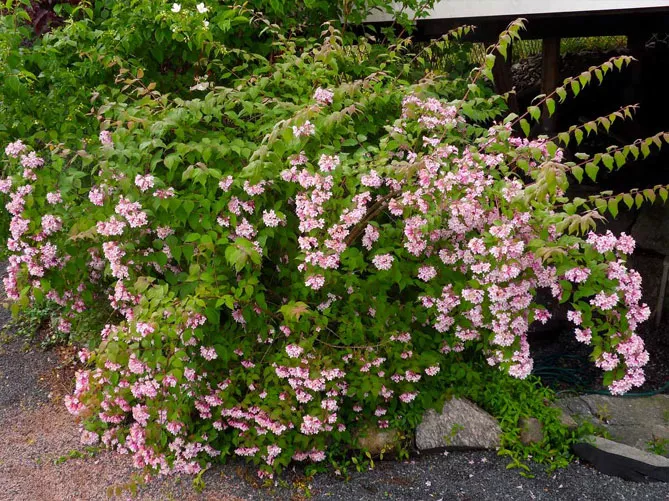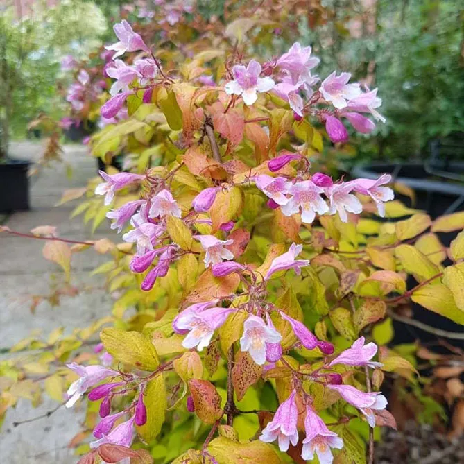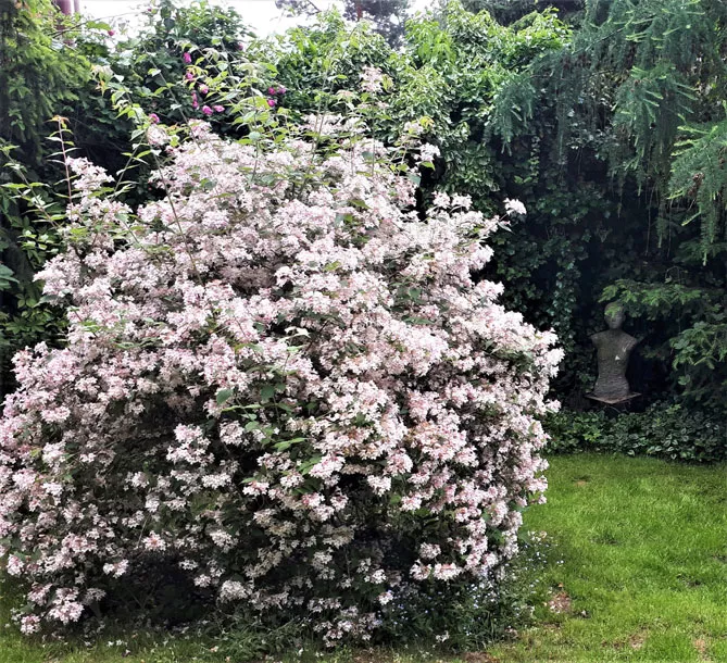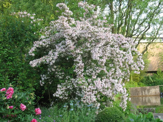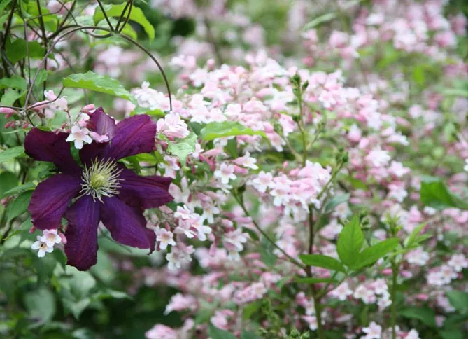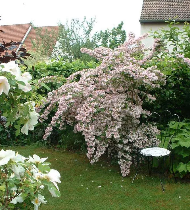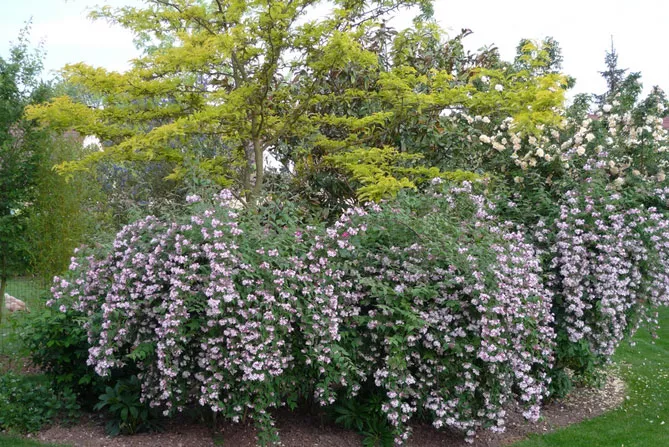 Стройний силует кольквіції чудово поєднується з більш компактними та невисокими кущами: