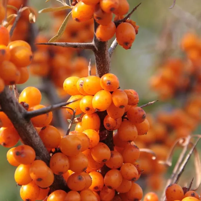 Ще один колючий садовий кущ – обліпиха. Рослина досягає кількох метрів у висоту, має вузьке сріблясте листя. Обліпиху прикрашають її плоди. В кінці літа – на початку осені кущ обсипається помаранчевими плодами, які буквально обліплюють його гілки, звідси й назва – обліпиха. Плоди обліпихи використовуються в кулінарії, є цінним джерелом багатьох вітамінів, мінералів. Господарки використовують їх для приготування смачних консервів, соусів до м'яса.