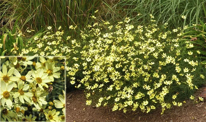 - Кореопсис мутовчастий (Coreopsis verticillata) – багаторічна рослина, росте до 50-70 см, утворює щільні кущики. Має дуже вузькі, голкоподібні, перисті листя, жовті квіти діаметром 4-6 см. Цвіте у липні-серпні. Вимагає сонячних позицій, використання опор. Цікаві сорти: