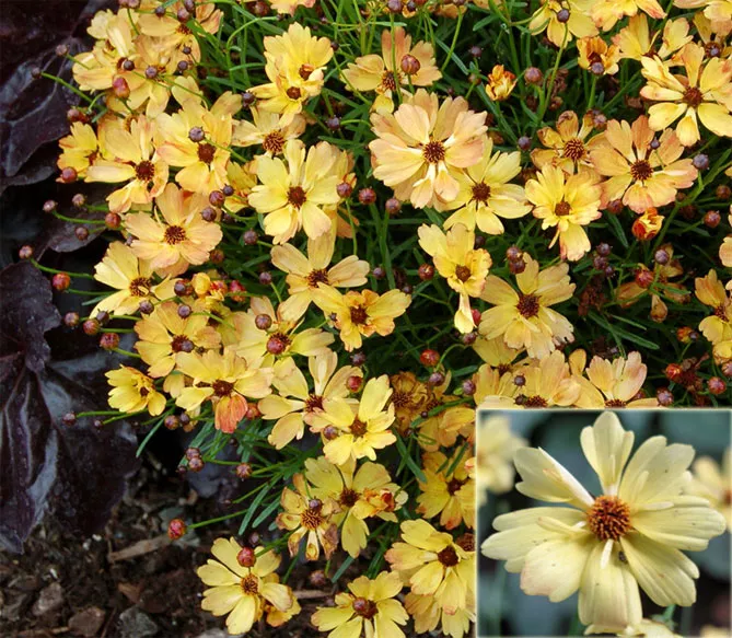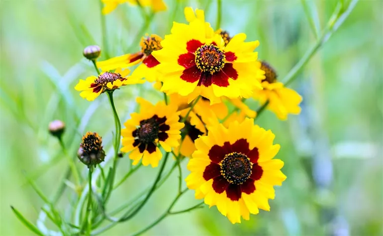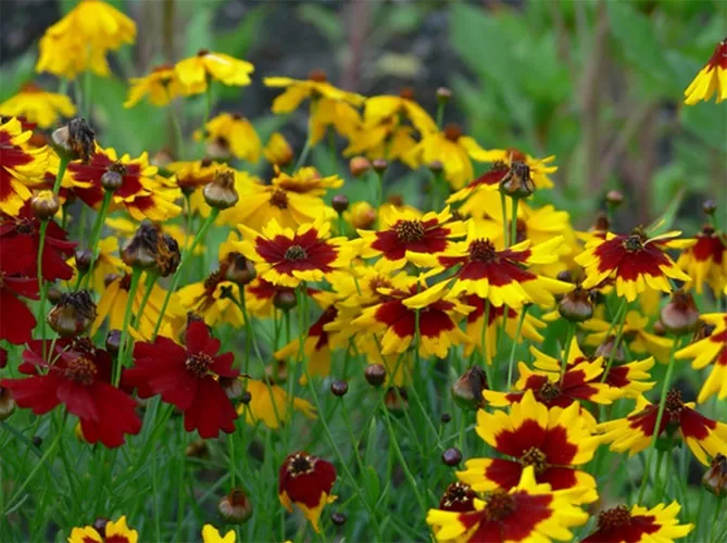 - Кореопсис Фарбувальний (Coreopsis tinctoria) – однорічна рослина має двоколірну квітку, росте до 40 см, утворює щільні кущики, період цвітіння – ближче до кінця літа. Віддає перевагу сонячним позиціям. Має невеликі перисті листя, дуже декоративні жовті квіти з широким фіолетово-бордовим центром. Включає низькорослі сорти, які можна вирощувати в горщику на балконі, і високі, ідеально підходящі для багаторічних рабаток. Підходять для зрізаної квітки.