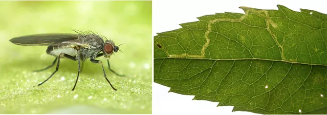 - Листова муха (Chromatomyia horticola) – мініатюрна двокрила муха. Самки протикають поверхню листа, личинки живляться всередині, утворюючи коридори, так звані шахти.