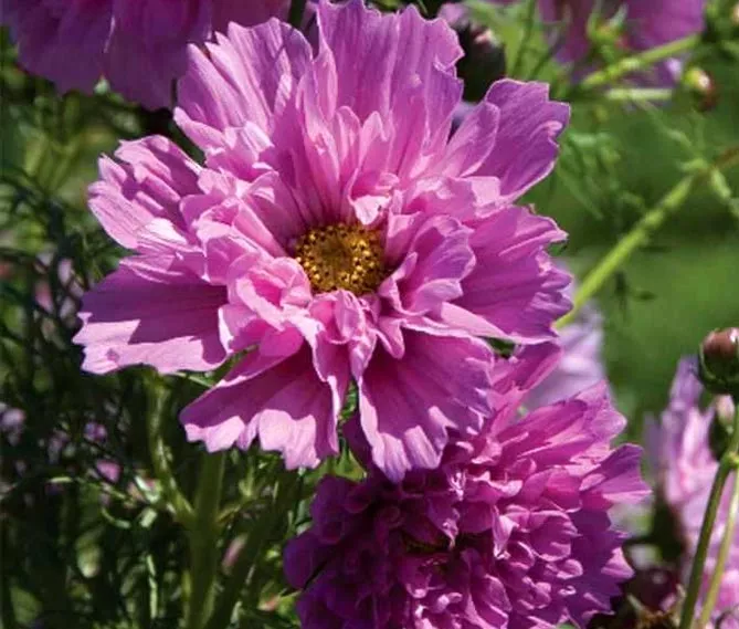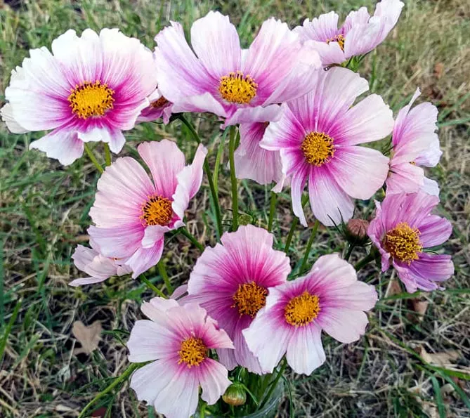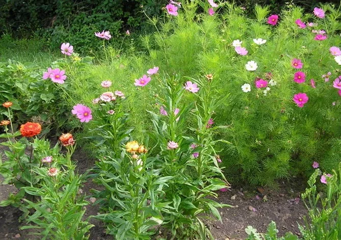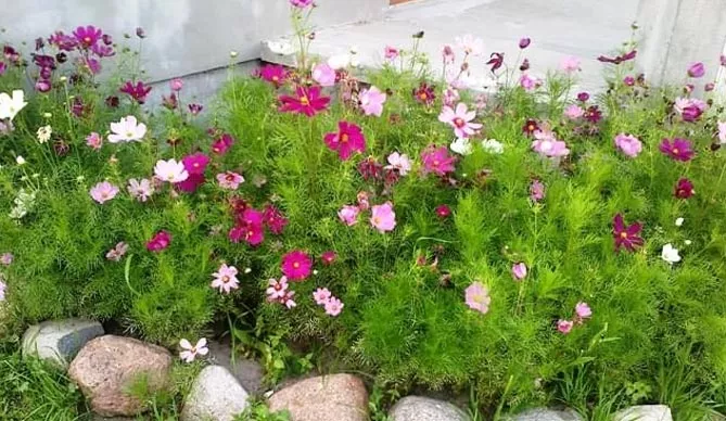 Клумба з космеєю виглядає як зелене небо густо всипане рожевими і білими зірками квітів. Оптимальні умови для розвитку – сонячні позиції і проникні ґрунти.
