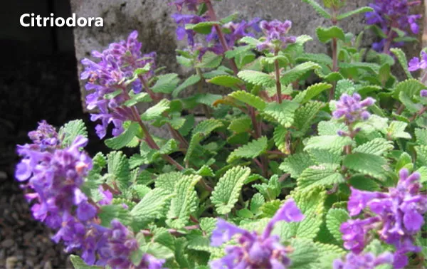 - Кошача м'ята (Nepeta cataria L.) – рослина з ароматним листям створює біло-фіолетові або світло-рожеві квітки. Досягає 100 × 60 см. Сорт «Citriodora» нижчий, має приємний цитрусовий аромат.