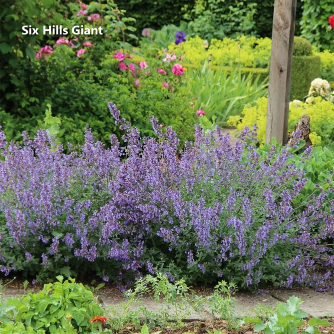 - «Six Hills Giant» з пурпурно-блакитними квітами, чудово поєднується з трояндами або пурпуровою геранню.