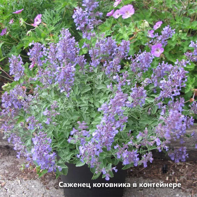 - Котяча м'ята сибірська (Nepeta sibirica) – вид з ароматним листям і пишними лавандовими квітами. Розміри 40 × 60 см. Сорт «Blue Beauty» цвіте синіми квітами.