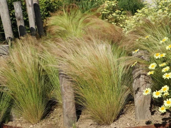 Дуже ефектна маленька трава – ковила пірчаста (лат. Stipa pennata) підходить для посадки на краю тераси або в горщику. Період цвітіння: червень-жовтень. Висота – 40 см. Її сріблясті насіннєві голівки ефектні і дуже поетично розвіваються на вітрі.