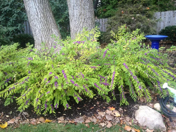 - У Callicarpa japonica листя стає золотистим з фіолетовими вкрапленнями.