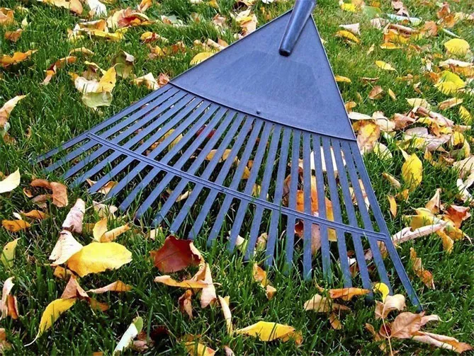Для збору листя можна використовувати спеціальні граблі. Листові граблі повинні розширюватися вниз і мати плоскі зубці. Вони не застрягають у газоні, ґрунті, дозволяють згрібати великі порції листя.