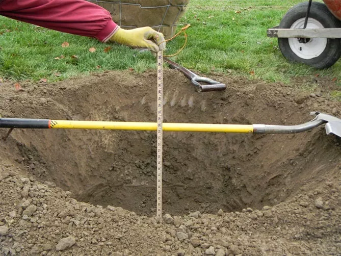 - Викопуємо яму діаметром 30 см, глибиною 40 см (якщо саджанець у контейнері – відповідно до його розміру). Яма має бути досить великою, щоб вільно садити рослину і повністю покрити кореневу систему грунтом.