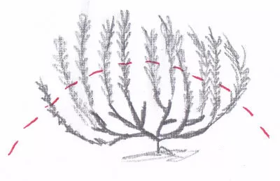 - Навесні (березень-квітень) пагони наполовину обрізають. Скорочуючи стебла, формують сферичну форму, що забезпечує рівномірний доступ повітря до внутрішньої частини кущика з кожного боку і хороше освітлення всіх пагонів. Обрізають тільки зелені рослини, залишаючи дерев'янисту частину непошкодженою, тому що вона повільно відновлюється.