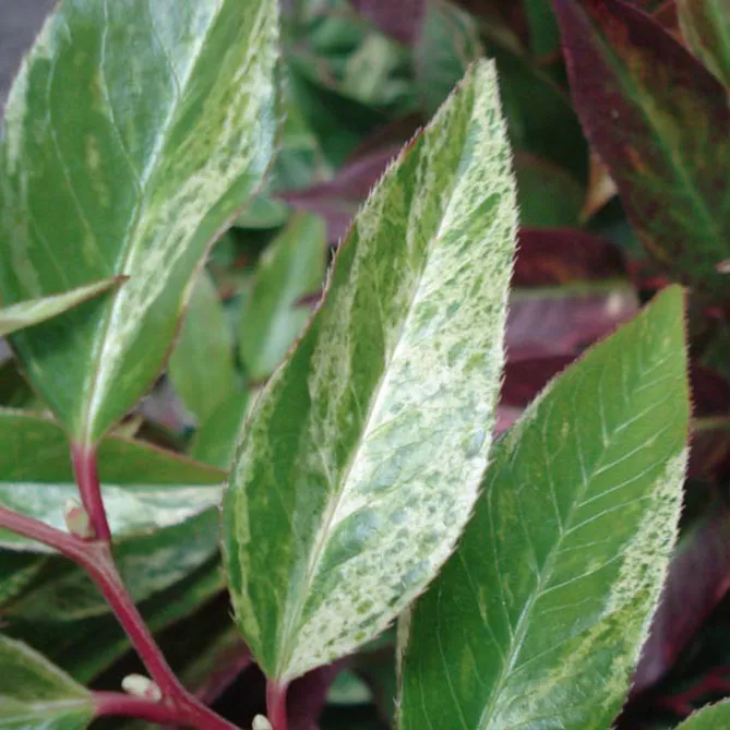 Леукотое Дефонтена «Вайтвотер» (Leucothoe fontanesiana Whitewater) цвіте з квітня по травень. Висота – 1,2 м. Сорт зачарує фіолетовими гілками, що контрастують влітку з досить світлим листям. Рослина прикрасить темні частини саду.