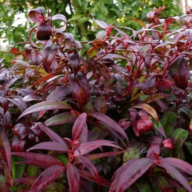 Листя щедро прикрашає гілочки, розташоване в пряму лінію на коротких черешках, має довжину до 8 см, шкірясте, вузьке, яйцеподібної форми, з гострим подовженим кінчиком. До кінця теплих літніх днів листя світло-зелене, оточене червонуватими краями. З настанням осінніх холодів з'являються численні плями бордового кольору, що поступово покривають все листя. Взимку захоплює поєднання винно-червоного, бордового та кармінового відтінків, що покривають весь кущ. Цвіте близько 4 тижнів у травні – червні. Білі квітки мають форму тонких дзвіночків завдовжки 1,5 см, зібраних у суцвіття по кілька сантиметрів, що звисають із пазух листя.