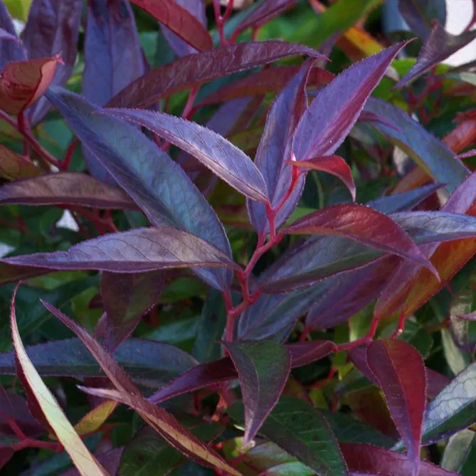 Листя розташоване на короткому черешку, ланцетне, завдовжки 7 см і 2 см шириною, цільнокрає, загострене, товсте, шкірясте, верхня поверхня глянцева, нижня матова. Навесні молоді листки стають винно-червоними та кармінними, до літа набувають свіжих, насичених зелених тонів, восени переходять до теплих відтінків бордового та коричневого.