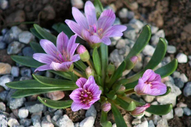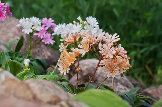 Левізія колумбіана або колумбійська (Lewisia columbiana) може похвалитися найдовшими квітковими пагонами, що згинаються в сторони під вагою безлічі білих квітів. Цвітіння починається в травні, триває в червні.