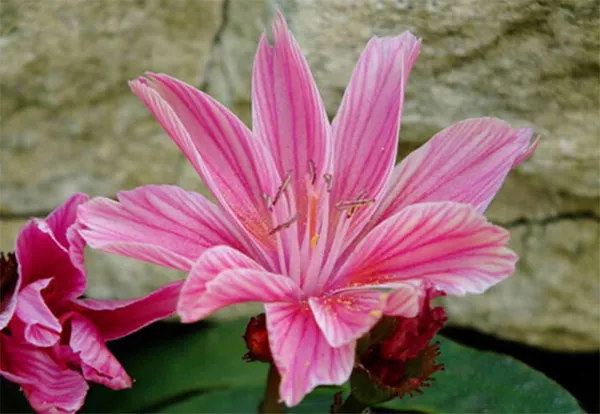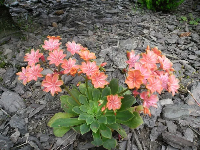 Левізія Твіда (Lewisia tweedyi) формує вічнозелену розетку (діаметром 20 см). Рослина на коротких стеблах. У травні можна насолоджуватися пастельними квітами діаметром 5 см.