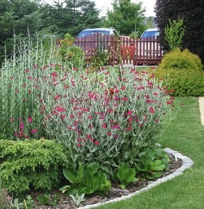 Срібляста оксамитова листка ліхнісу також знадобиться в саду в англійському стилі, щоб прикрасити підошву старих троянд, візуально підкреслюючи їх цвітіння. Для такої композиції відмінно підійде дуже романтичний ліхніс сорту «Енджелс Блаш» з ніжно-рожевими пелюстками, обрамленими білою каймою.