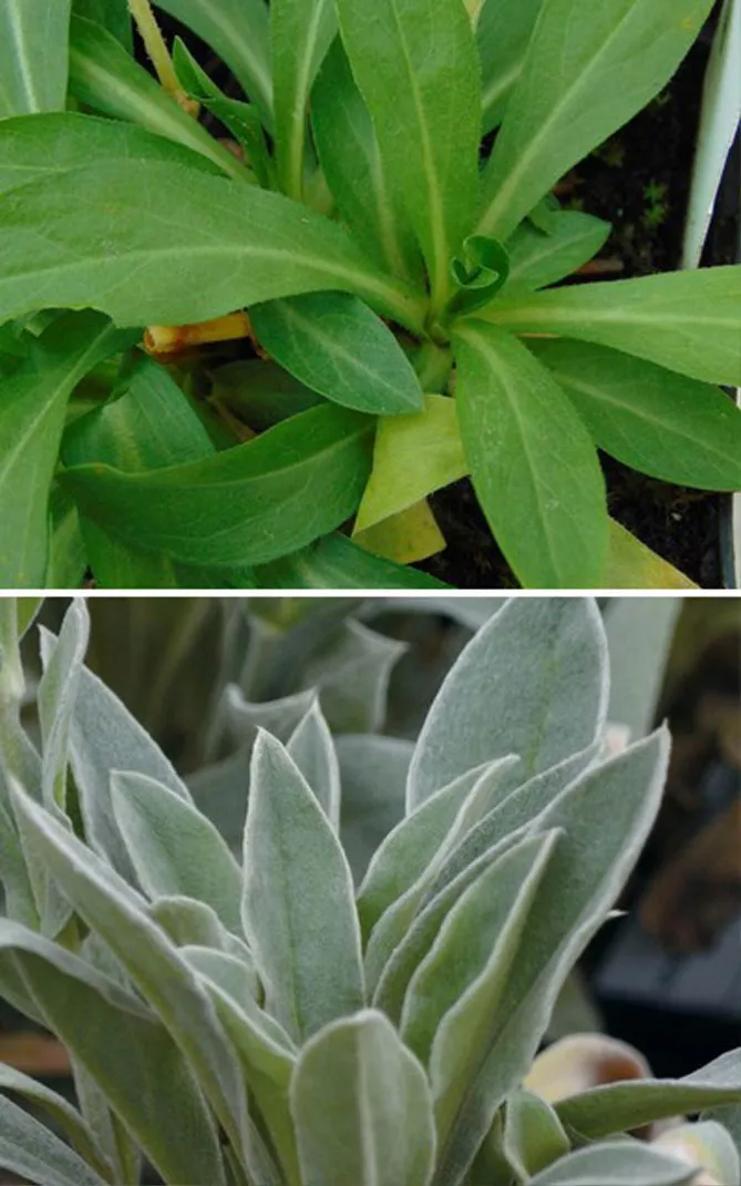 Фото. Листя: зелені та гладкі у Lychnis chalcedonia, сірі та опушені у L. coronaria