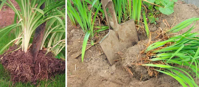 Кущ лілейника обкопується акуратно навколо. Потім гострим ножем робиться розріз кореневища на частини з окремими стеблами. Якщо кущ дуже старий, розрослий, кореневище стає величезним. Тоді доведеться рубати ком з кореневищем лопатою на частини.