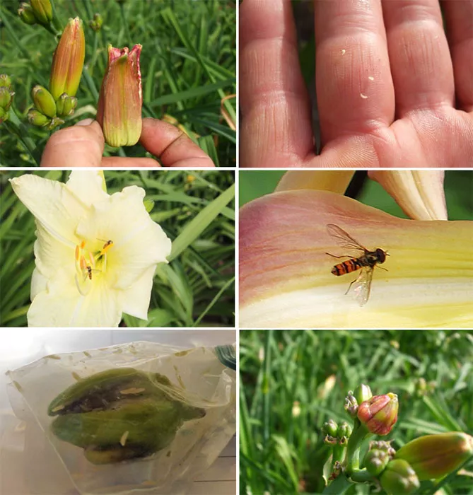 Спостерігається на лілейниках поява двокрилих, личинки яких розвиваються всередині квіткових бруньок, викликаючи відсутність цвітіння. Комаха рано навесні відкладає яйця на бруньки лілейників, в глибині зародку виростає велика кількість дрібних личинок розміром 1-2 мм. Потім у червні личинки виходять з квітки лілейника, падають на землю, де вони зимують у коконах. На поверхню з'являються навесні, щоб відкласти яйця на бруньках.