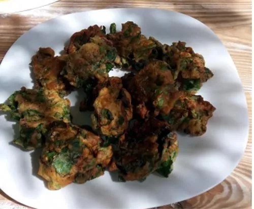 Сухі інгредієнти і суміш трав перемішуємо, додаємо яйце і молоко, щоб тісто мало консистенцію, схожу на тісто для оладок. Листя без черешків подрібнюють і змішують з тістом. Оладки смажать на сковороді в великій кількості рослинної олії до золотистого кольору.