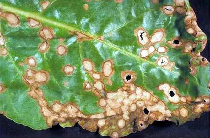 - Церкоспороз мангольда або плямистість листя. Швейцарський мангольд сприйнятливий до плямистості листя, викликаної грибком Cercospora hydrangeae – захворювання вражає листову пластину, викликає сірувато-сірі плями з фіолетовим краєм. Зустрічається на зовнішніх листках. Хвороба поширюється дуже швидко, вражає молоді листя. Сприяє розвитку хвороби тепла, волога погода. Особливо часто з'являється в Херсонській, Запорізькій областях, на заході України, в посушливих регіонах хвороба зустрічається рідко. Заходи боротьби : 1% бордоська рідина або топсин 70% при перших ознаках.