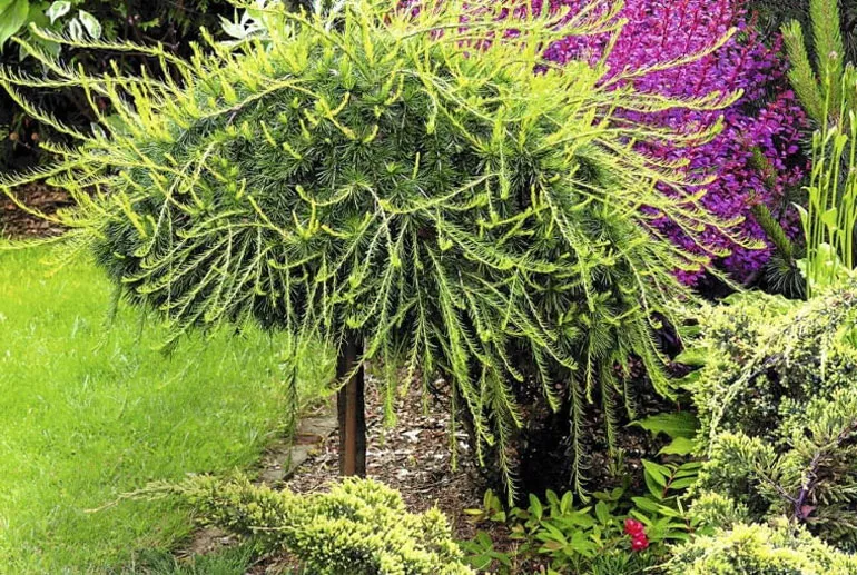 Вирощування модрини на штамбі не доставить проблем. Таке дерево більш стійке до посухи та легкої тіні. Воно повільно росте.