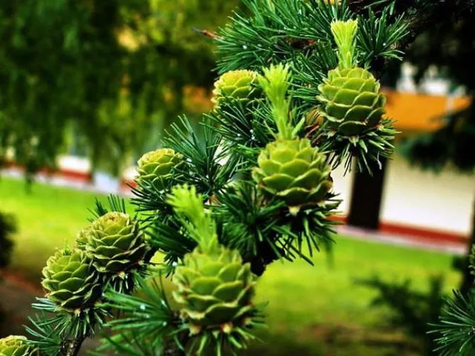Цвітіння модрини припадає на березень-квітень – з бруньок ледь з'являються букети тонких ніжно-зелених голок. Згруповане розташування голок нагадує кедр.