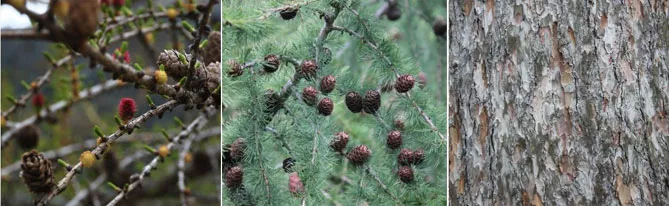 Фото. Модрина європейська: чоловічі квітки (жовті сережки) та жіночі квітки (червоні шишки) на одній гілці, шишки та дрібні м'які голки, потріскана та луската кора.