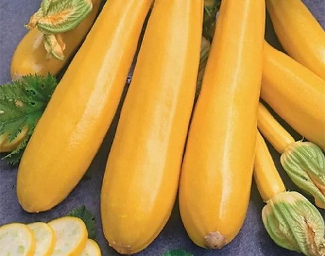 - Жовтоплодний. Насіння сорту висівають у відкритий ґрунт в останніх числах травня. З моменту появи сходів до формування першого плоду проходить приблизно 7 тижнів. Кожен кущ здатний дати приблизно 9,5 кг і цю урожайність можна підвищити, проводячи регулярні розпушування ґрунту, вносячи мінеральні добрива в процесі вегетації. Кабачок має правильну звичну форму. Шкірка досить тонка, м'якоть без волокон, бежевого забарвлення. Маса одного плоду в межах 1 кг, плоди легко перевозити, зберігати взимку.
