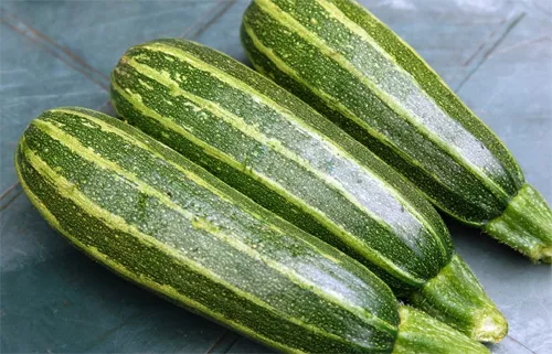 Яскравий представник кабачків - цукіні, що відрізняється неперевершеним смаком, ароматом. Під оболонкою плоду сховано ніжний вміст з незначною кількістю насіння. Покривна оболонка цукіні майже прозора, її не видаляють при тепловій обробці. В виключно смачних плодах містяться вітаміни різних груп, вуглеводи. Сорт швидко достигає, збір ведуть через місяць від посадки розсади. Без наслідків переносить скачки температур, на будь-яких типах ґрунтів показує відмінну продуктивність. Плід в середньому важить 600 г. Рослина приземкувата, не пагонові, має інтенсивно забарвлене зелене листя з потовщеними прожилками. Кабачки смугасті. |