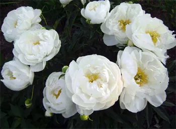 | Сноу Маунтін | Піони з кремовими суцвіттями великого діаметра, із скругленими пелюстками. Квітконоси міцні, але злегка схиляються. Сорт зимо- та посухостійкий. | ![]() |
