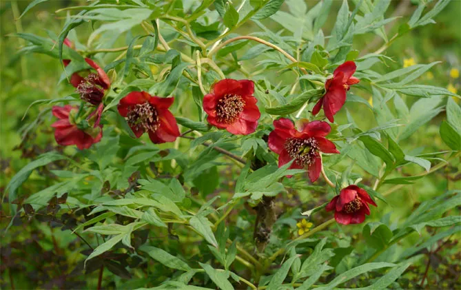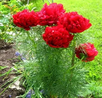 Також цікавий вид тонколистого піона (paeonia tenuifolia), заввишки 30-50 сантиметрів. Ніжна квітка розцвітає вже на початку травня. Він зазвичай має темно-рожеві квітки та дуже характерне листя з ниткоподібними ділянками, що нагадують листя фенхелю.