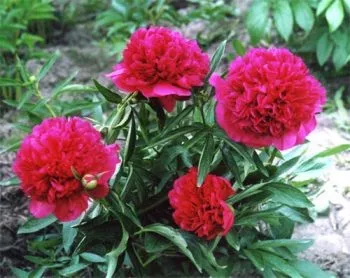 | Піон Вітмана | Особливість даного сорту – соковитий красно-рожевий колір квіток з рожевим опушенням у середині. Листяна складова зелена, черешки – алі. | ![]() |