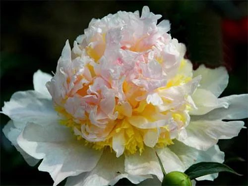 | Піон Цитерія | Злегка розлогий піон, заввишки до 90 см. Бутони у розкритому стані густомахрові, рожевувато-кремові з жовтизною біля основи, великі. Наприкінці цвітучого періоду перефарбовуються у білий колір. | ![]() |
