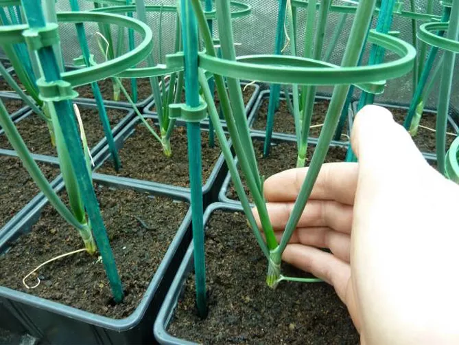 - Перерослому пір'ю, що зазвичай трапляється при 20 °С і вище, потрібно забезпечити підтримку, щоб не полегло, або підстригти його. Обрізати на 1/2 або 1/3 зелень можна 2-3 рази за час вирощування розсади. Це не дуже добре, але допустимо.