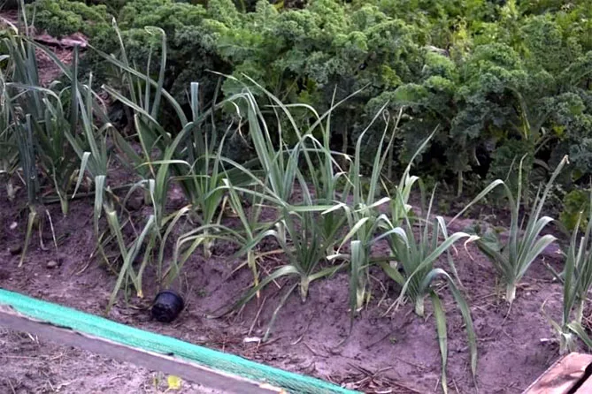 - Порей можна зберігати у грядках. Важливо, щоб грунт на грядці був сухим. Цибулю поміщають у грядки на таку глибину, щоб покрити відбілену частину. Зелена частина рослини повинна виступати над насипом. Грядку покривають соломою або іншим матеріалом, що використовується для ізоляції.