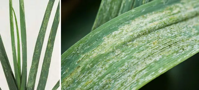 Симптоми ураження. Трипси висмоктують клітинний сік з тканин листя цибулі. Повітря потрапляє в пошкоджені клітини, викликаючи дрібні, біло-сріблясті плями (див фото).