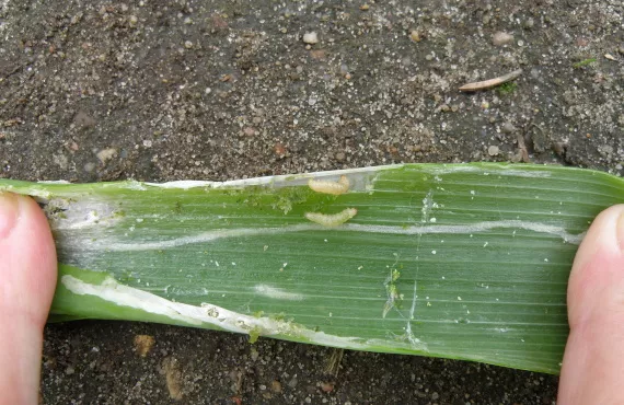 Симптоми ураження. Самки проколюють листя, п'ють сік, що витікає. Типовий симптом харчування личинок – пошкодження потовщеної частини стебла порею. У місцях проникнення самок утворюються білі плями, рядами що йдуть вздовж листа. Там також можна знайти яйця, що відкладаються самками. Через кілька днів з них виводяться личинки, які спускаються по рослинах, утворюючи вузькі тунелі, так звані міни (фото). Личинки першого покоління викликають деформацію листя та перешкоджають розвитку порею. Пошкодження, спричинені личинками другого покоління, спочатку залишаються непоміченими. На пошкоджених ділянках тканини спочатку рожеві, потім коричневі сліди.