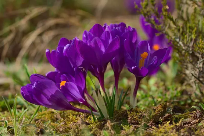 Крокус (шафран) весняний (лат. Crocus vernus) тішить око з березня. Рослини називають першими вісниками весни, разом з підсніжниками вони роблять світ прекраснішим. Їх красиві квіти найчастіше бувають пурпурного, рожевого, білого, синього або жовтого кольору. Вони виглядають фантастично, коли граціозно з'являються з землі і розкривають свої прекрасні квіти. Висота – 15 см.