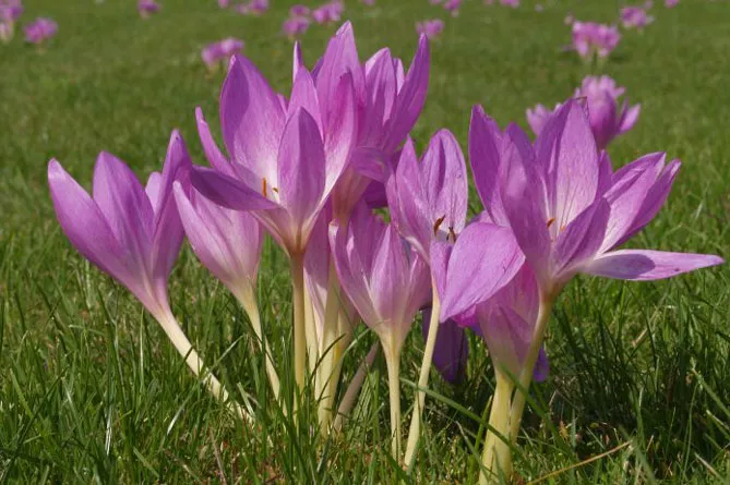 Дуже схожий на крокус квітка пізньоцвіт осінній, часто ці дві квітки плутають навіть досвідчені садівники. Їх відрізняє лише поведінка в саду. Крокуси спочатку цвітуть, а потім дають листя, пізньоцвіти випускають листя ранньою весною, потім засихають і зникають, щоб випустити квіти восени – з серпня по жовтень. Вони красиві, бувають різних кольорів: від білого до блідо-рожевого, пурпурного. Грона цих квітів чудово виглядають на траві, і якщо садівник утримається від стрижки газону в цей період, вони будуть його прикрасою всю осінь.