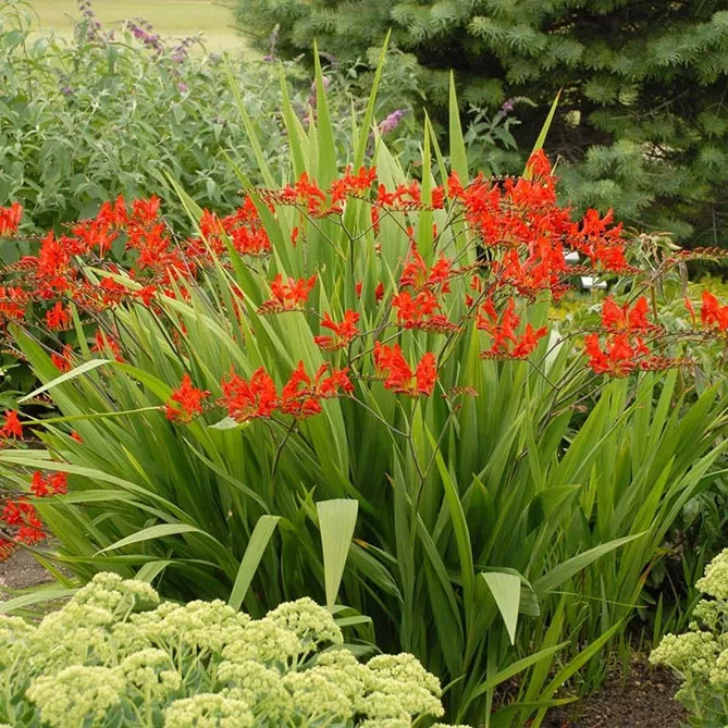 Крокосмія досягає 60-90 см у висоту. Вона утворює суцвіття, що складаються приблизно з 20 помаранчево-жовтих квіток, розташованих супротивно. Цвіте влітку. Детальніше можна почитати тут — cvetok-krokosmiya-montbretsiya-posadka-i-uhod