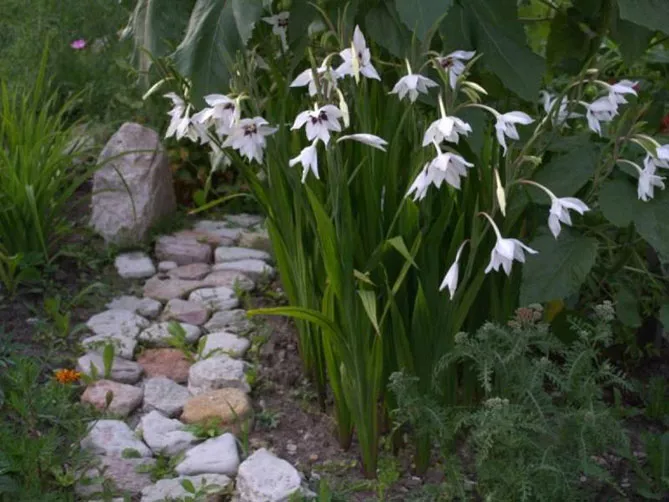 Гладіолус (Шпажник) Мюріел або ацидантера досягає висоти 45-60 см. Довгі, зелені, загострені листя є фоном для ефектних квітів. Квіти великі, білі з фіолетовим горлом, дуже приємно пахнуть вночі. Розпускаються в кінці літа – на початку осені – з серпня. Квітки в суцвітті розкриваються послідовно.
