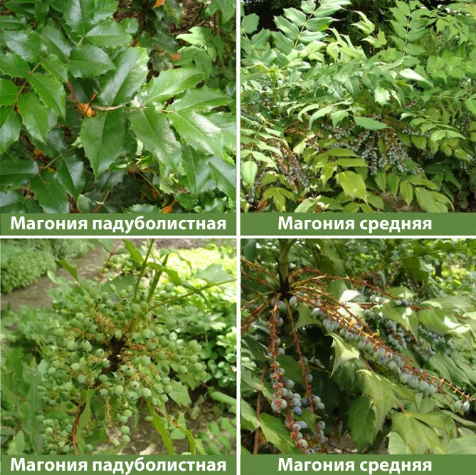 Найпоширеніший вид магонії в садах – падуболиста (Mahonia aquifolium). Має 5-9 листочків на одному черешку, а Магонія середня (Mahonia х media) – 14 -22 листочки. Вид (Mahonia х media) відрізняється від падуболистої набагато більш видовженими суцвіттями, плодами, довгими, тонкими листям.