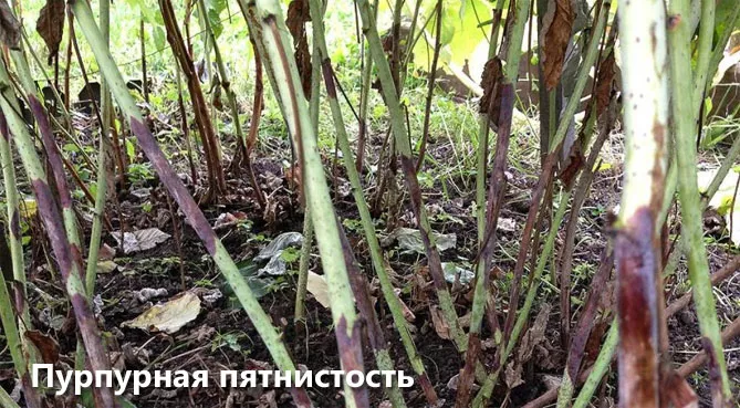 | Пурпурова плямистість | На пагонах виникають бурі плями з фіолетовим відтінком, бруньки засихають, листя в'яне. | Не загущувати насадження. Виносити з ділянки та спалювати опале листя. Обробити кущі до фази цвітіння 1% бордоською рідиною. |