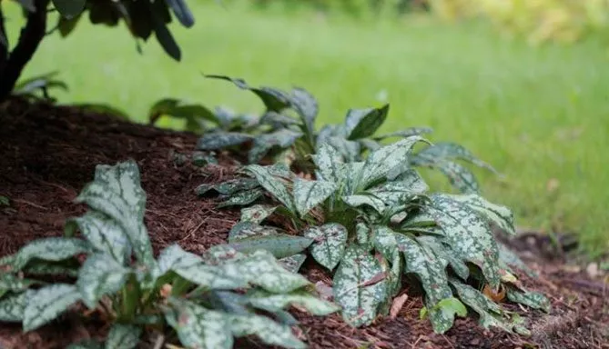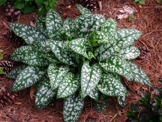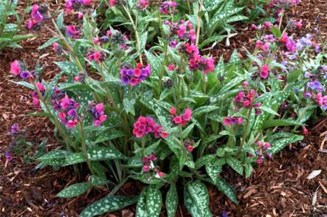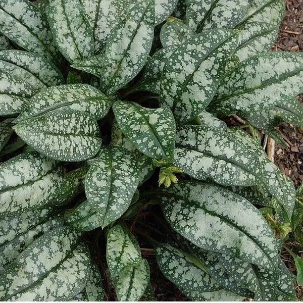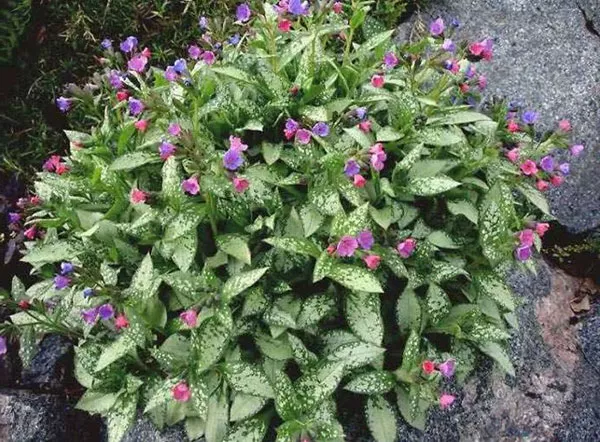 - «Муншайн» Moonshine – яскравий багаторічник з пишною декоративною листкою і привабливими весняними квітами, сягає 30-45 см. Рослина радує великим скупченням овальних блискучих плямистих листків. Молоді листові пластинки світло-зеленого кольору з сріблястими плямами. Старі – сріблястого кольору з цікавою облямівкою темно-зеленого кольору. Багато цвіте з квітня. Над декоративним пучком різнобарвних листків з'являються красиві рожеві квіти у формі дзвіночків, які в міру дозрівання стають світло-блакитними.