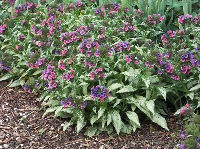 - «Блю міст» Blue Mist – утворює на одній рослині квіти двох кольорів – пурпурового та рожевого. Цвітіння починається з березня. Відрізняється яскраво забарвленими зеленими листками, вкритими сріблястими плямами. Винятково декоративні листки не змінюють забарвлення протягом усього вегетаційного періоду рослини. Висота: 30-40 см.