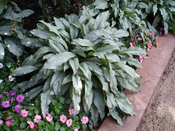 - «Сілверадо» Silverado – виростає приблизно до 40 см, утворюючи компактний горбик з ланцетних листків із загостреним кінцем та характерним сріблясто-сірим забарвленням. У квітні-травні над щільним кущем височіють м'ясисті, злегка опушені пагони, увінчані чарівними рожевими повітряними квітами. Філігранні дзвіночки зібрані в двосхилі зонтики та змінюють забарвлення в міру росту. Спочатку рожеві, з часом набувають інтенсивніших синьо-пурпурових відтінків.