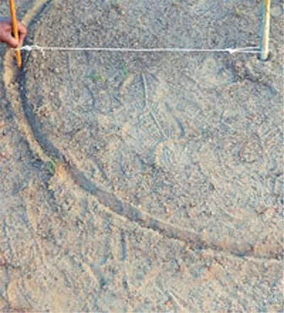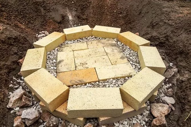 - Викопуємо яму діаметром 1 метр, глибиною 40 см. Для цього вбиваємо стрижень, прив'язуємо до нього мотузку. Використовуючи цей «циркуль», окреслюємо на землі дерев'яною паличкою коло. Видаляємо землю з кола, засипаємо гравій, утрамбовуємо. По контуру розміщуємо нижній шар цегли. Укладаючи шари потрібно перевіряти правильність укладання за допомогою рівня.
